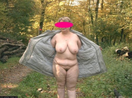 Толстая голая старуха на природе