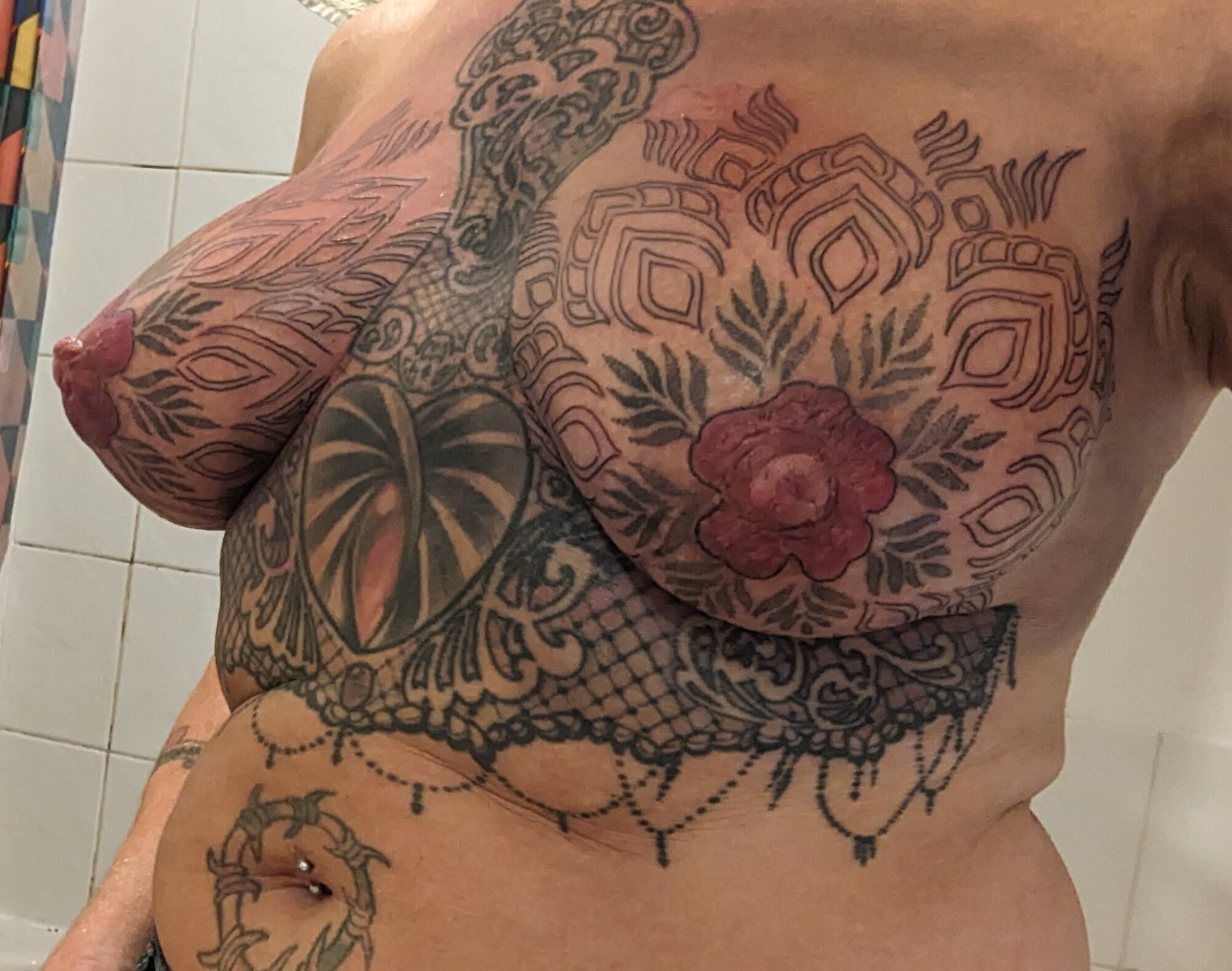 Татуированные груди с пирсингом